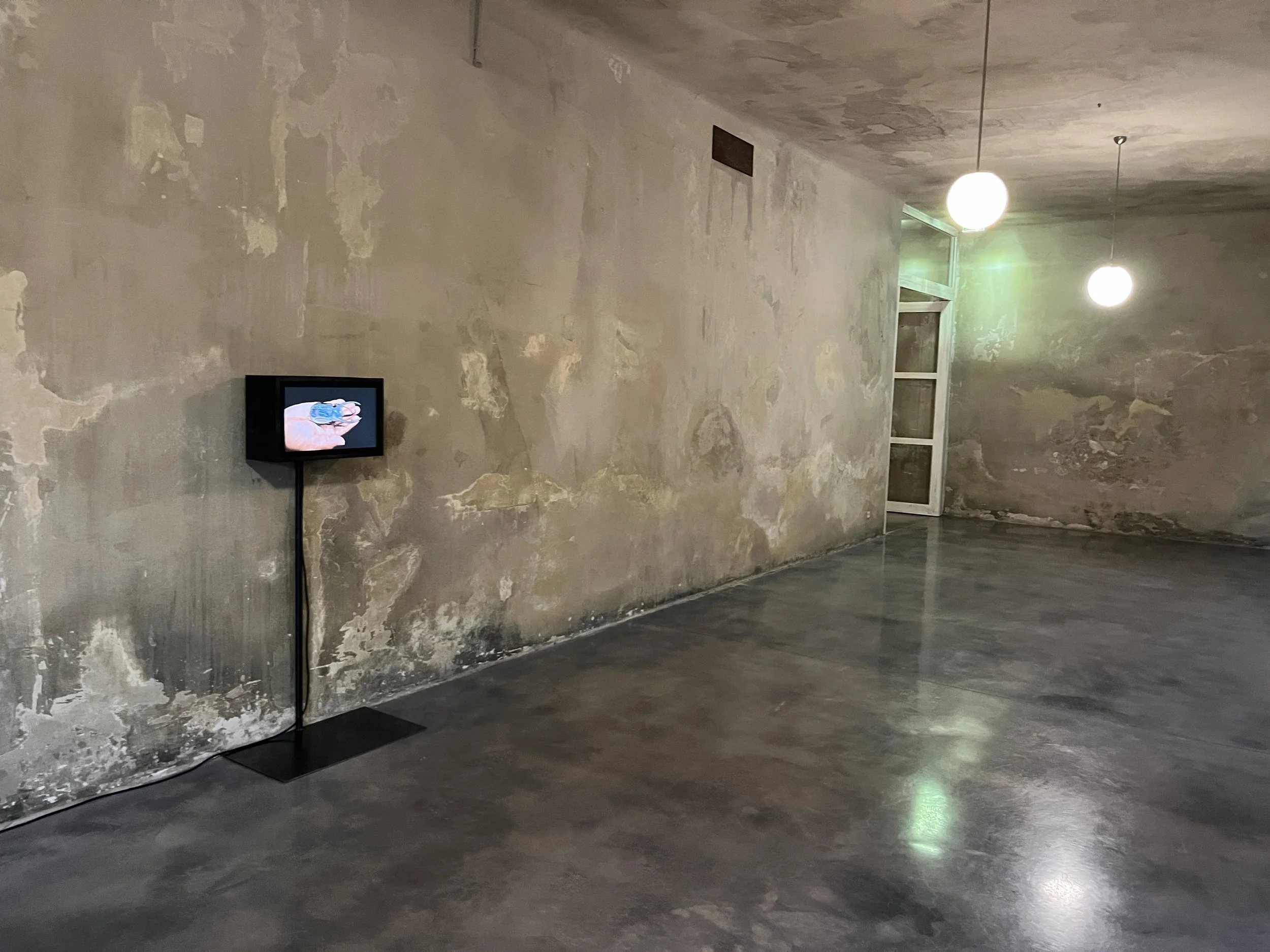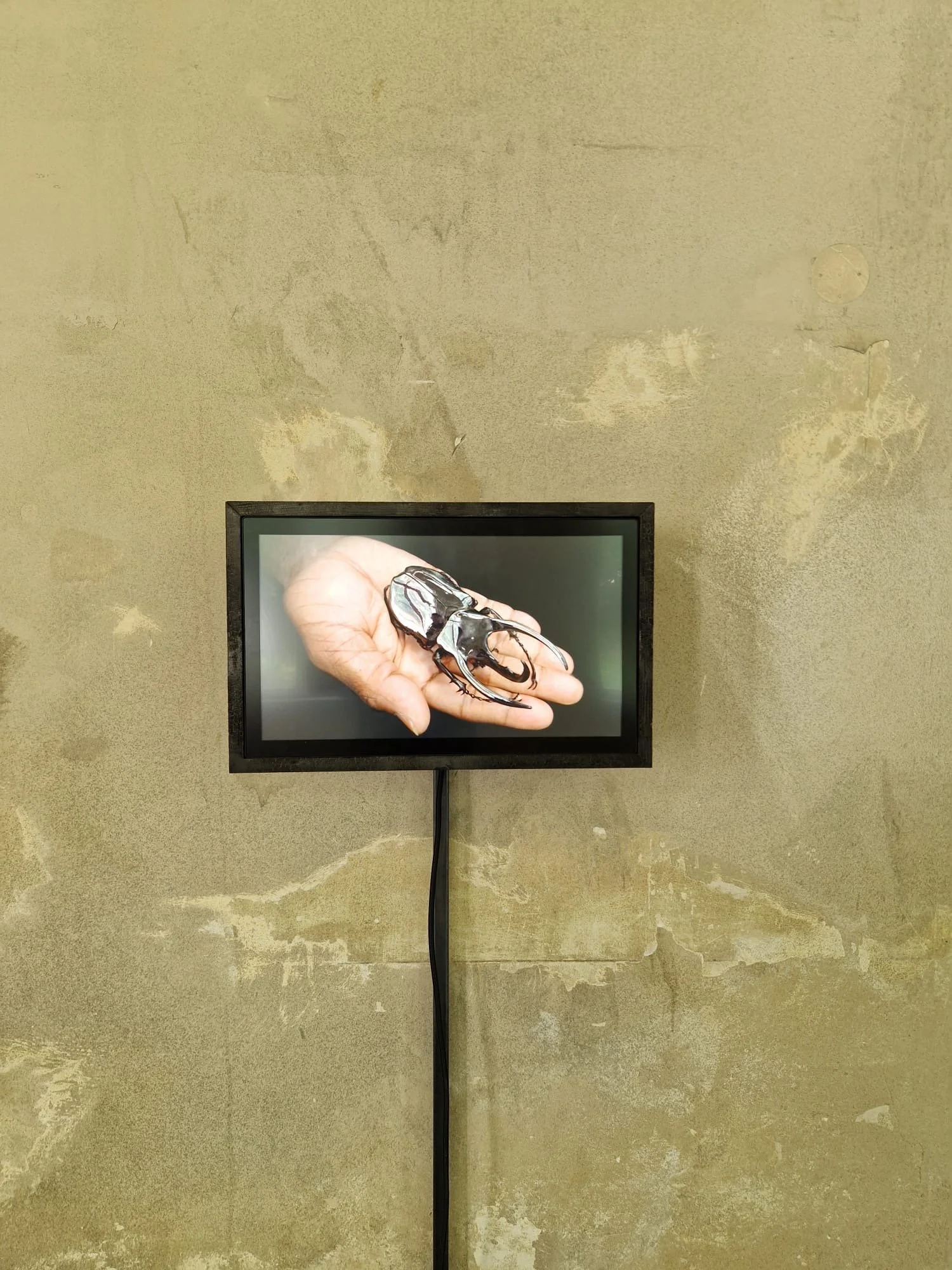 Freistehender Medienträger für die fokussierte Präsentation im Raum. Die rohe Materialität und schwere Bodenplatte garantieren dauerhafte Standfestigkeit. Durch die radikal reduzierte Tragstruktur wird das Objekt zum dienenden Raumelement. Diese architektonische Klarheit bietet dem digitalen Inhalt eine unaufdringliche Bühne.