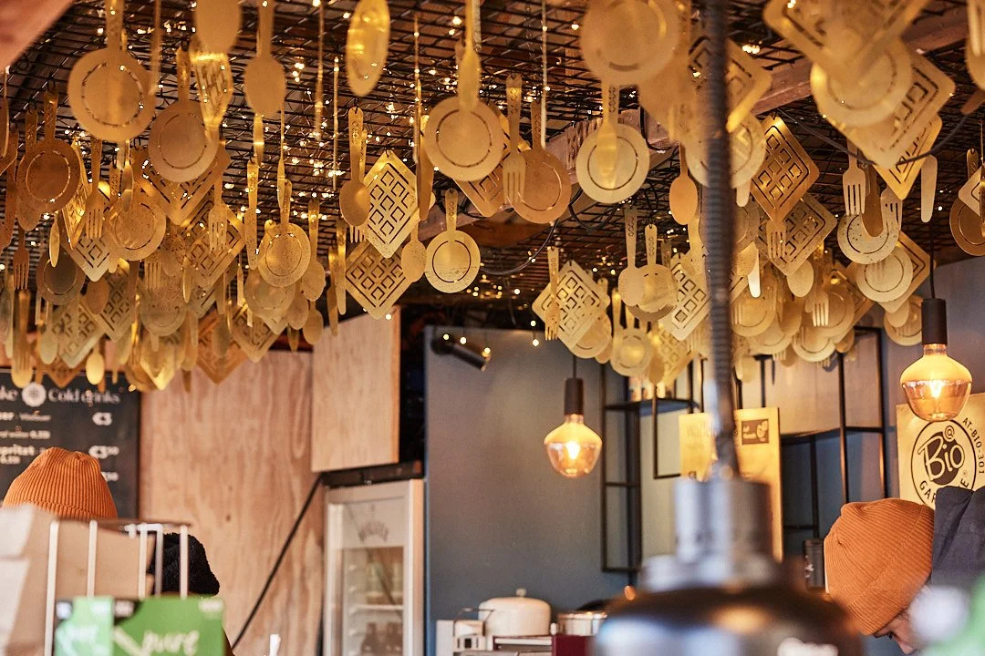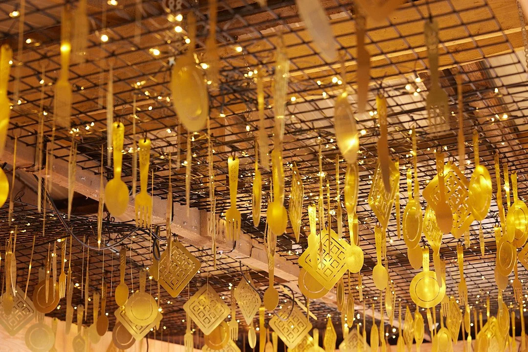 Die Deckeninstallation besteht aus rund 600 ausgelagerten, nur 0,5 mm dünnen Elementen in der Anmutung von Gabeln, Löffeln, Waffeln und Pfannen. Durch gezielte Beleuchtung und sanfte Bewegung entsteht ein weihnachtlich anmutendes, lebendiges Spiel aus Licht und Reflexion.
