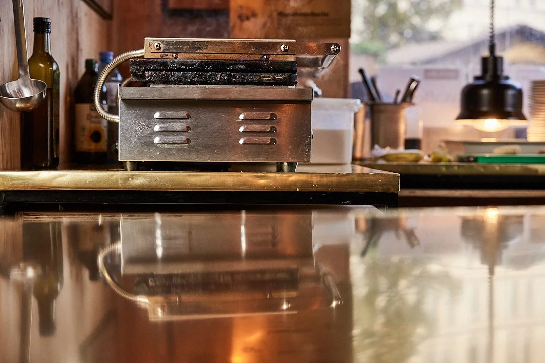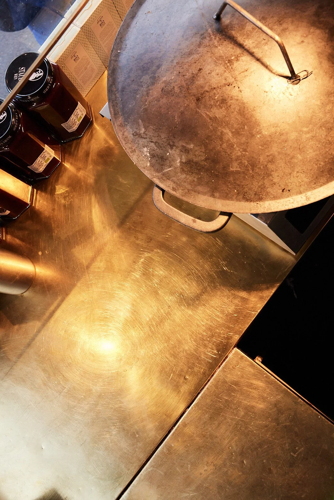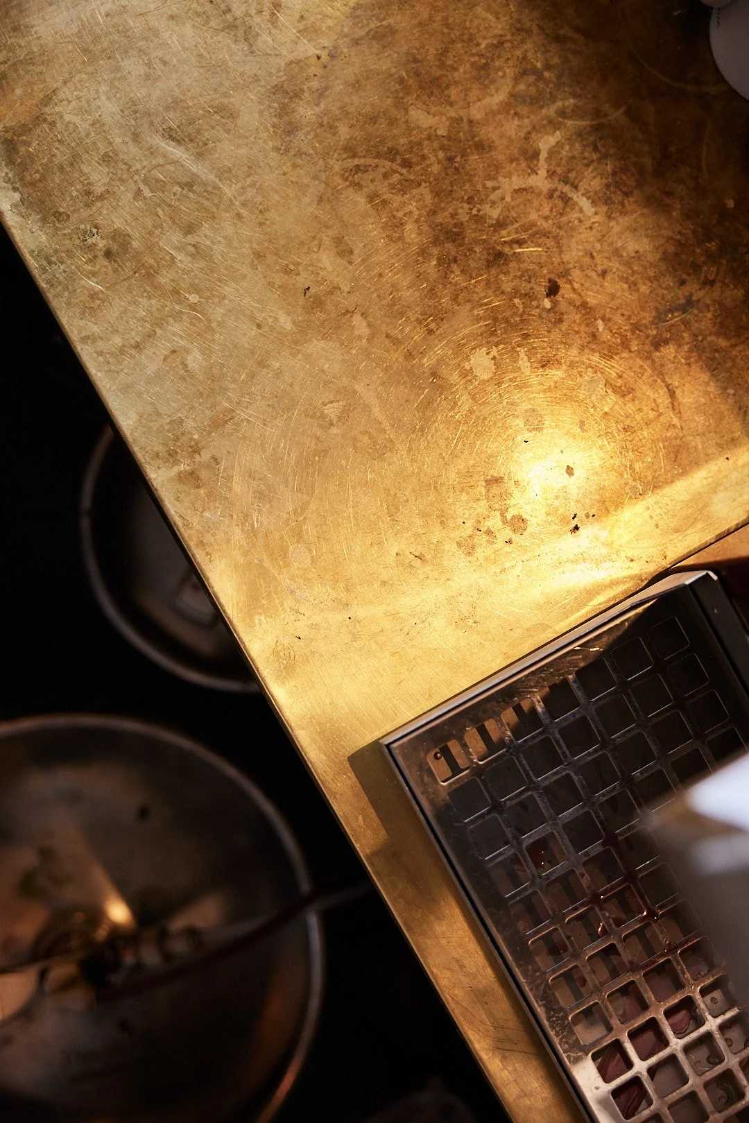 Wärme entsteht durch die gezielte Materialwahl – Messing-Finish auf den Tischen sorgt für eine natürliche Präsenz und Interaktion mit der Umgebung. Das Material reagiert auf Flüssigkeiten und Temperaturen, wodurch eine lebendige Oberfläche entsteht, die durch einfaches Abwischen hygienisch bleibt und dennoch ihre charakteristische Patina durch Benutzung entwickelt.