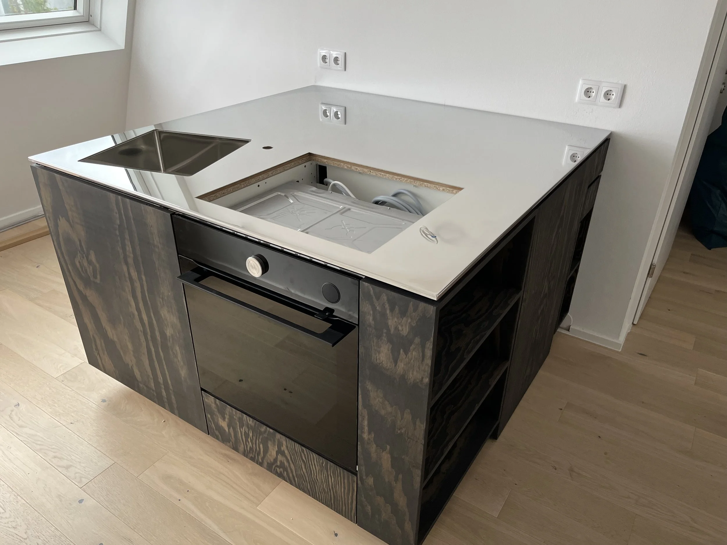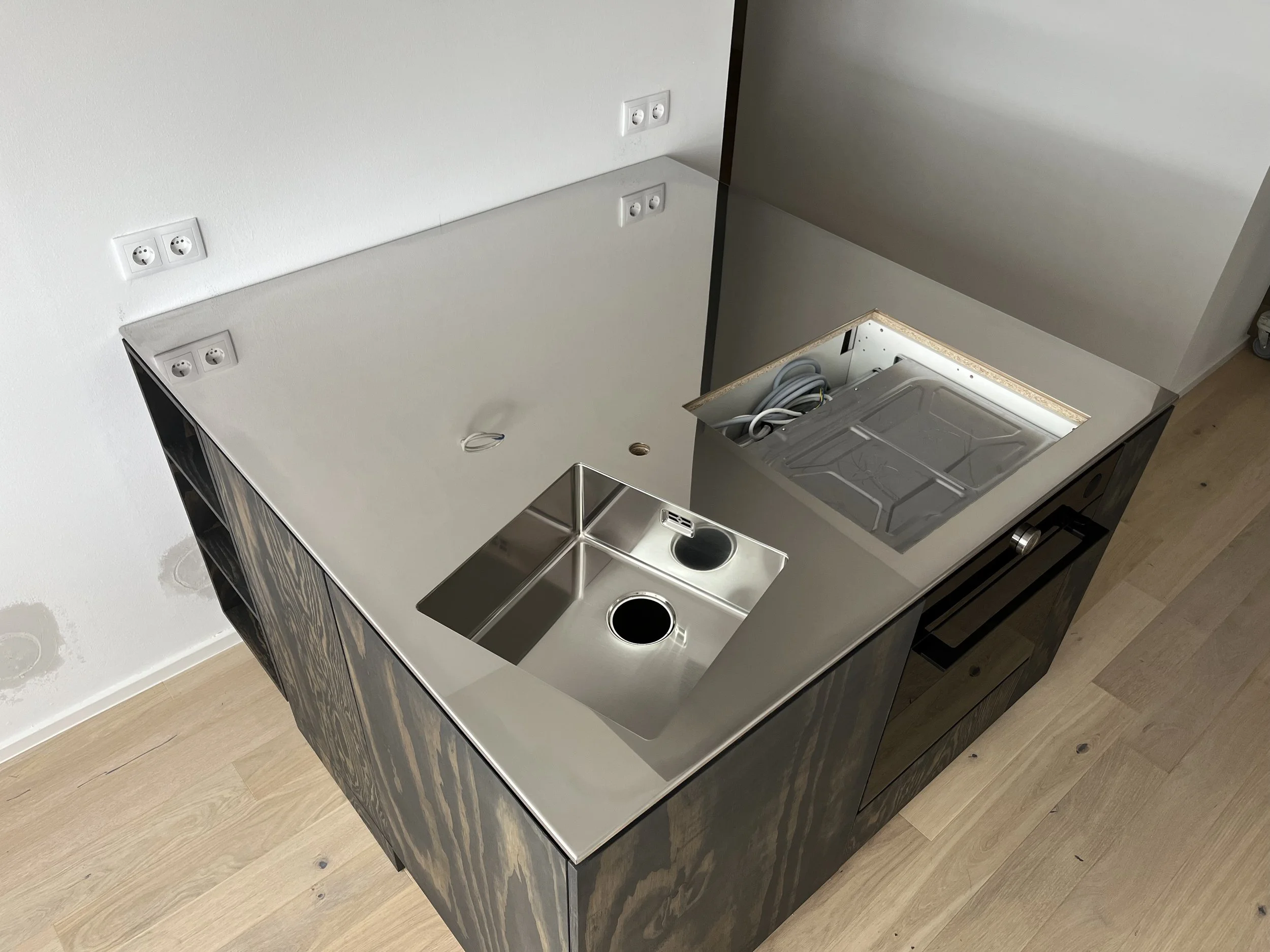 Arbeitsküchenplatte aus Edelstahl Spiegeloptik.